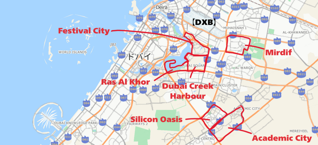 経由:Dubai Festival City → Dubai Creek Harbour → Ras Al Khor → International City(1,2,3)→ Dubai Silicon Oasis → Dubai Academic City